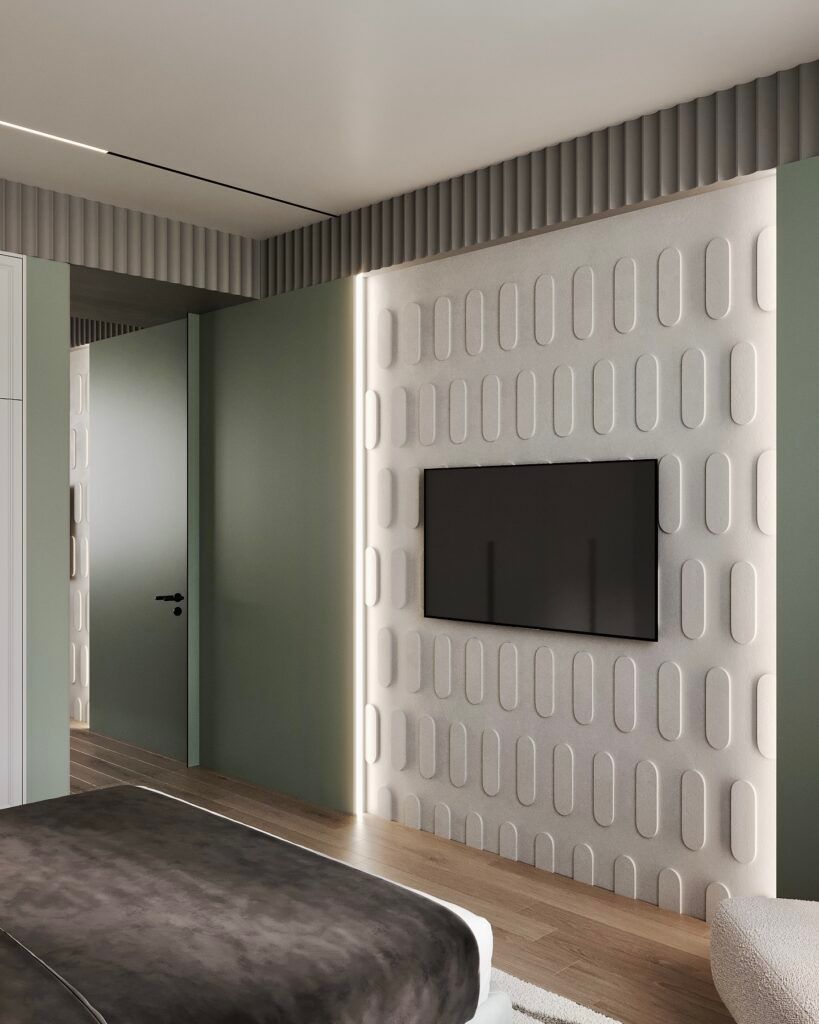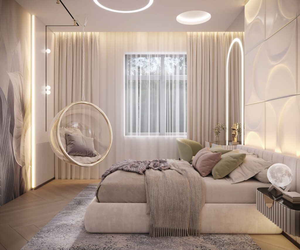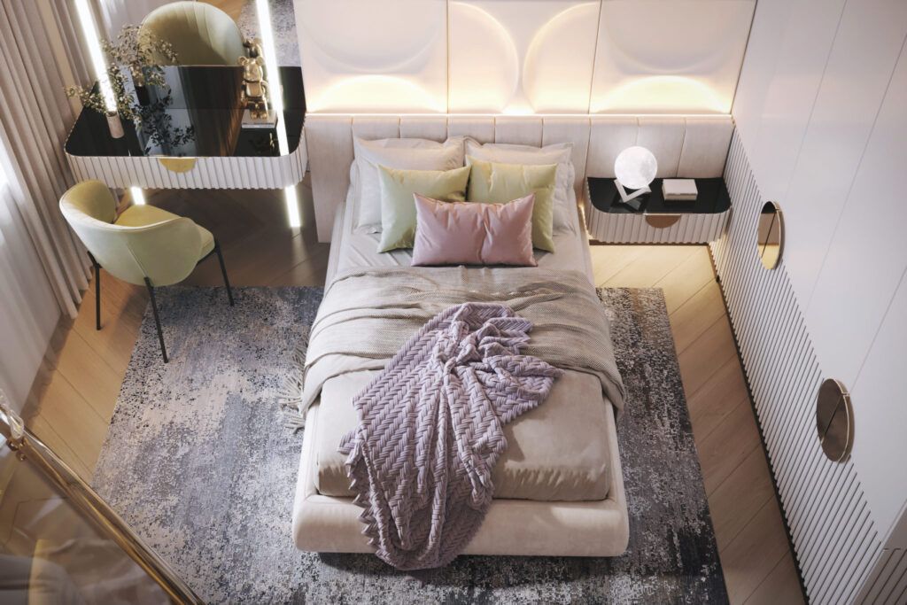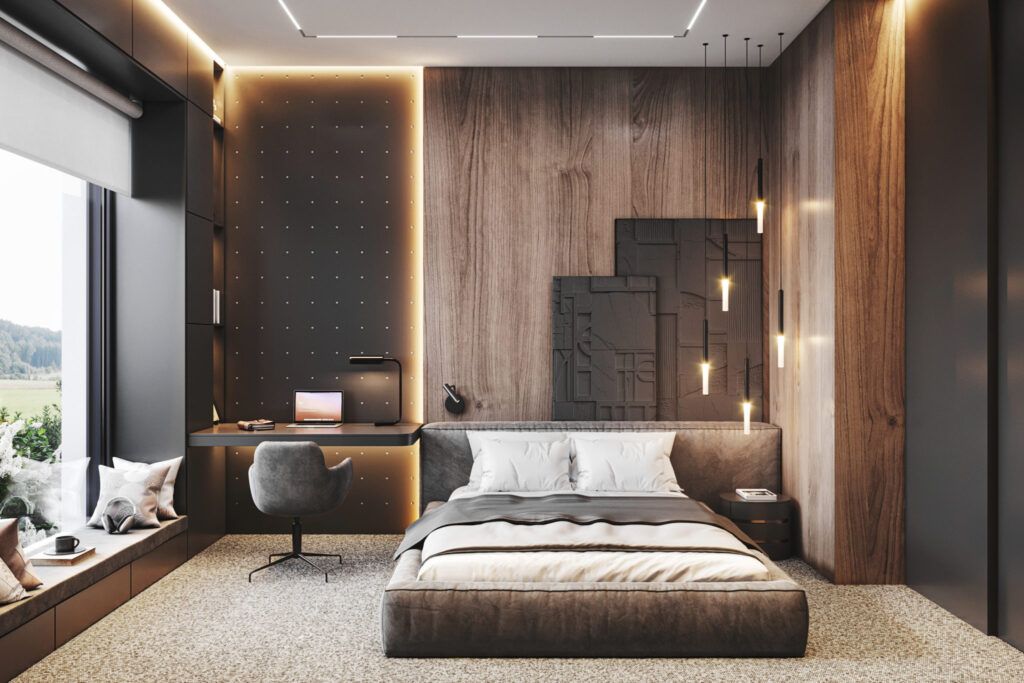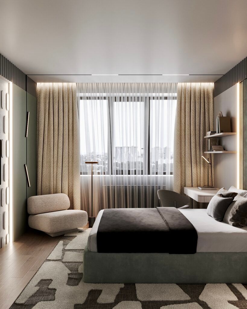 - Использования разных отделочных материалов в различных зонах, например, выделения акцентной стены над кроватью.