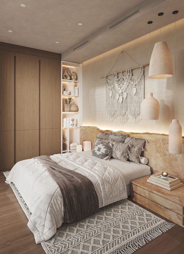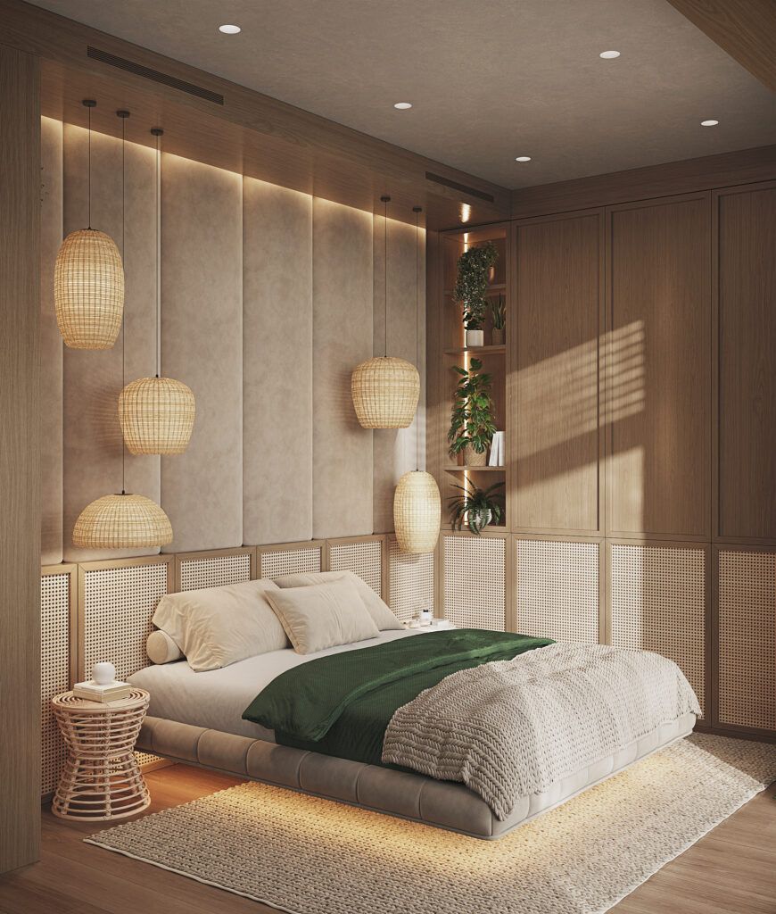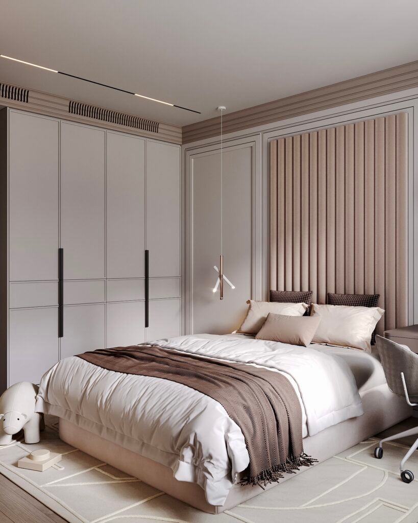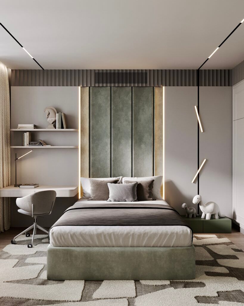 - Использования разных отделочных материалов в различных зонах, например, выделения акцентной стены над кроватью.