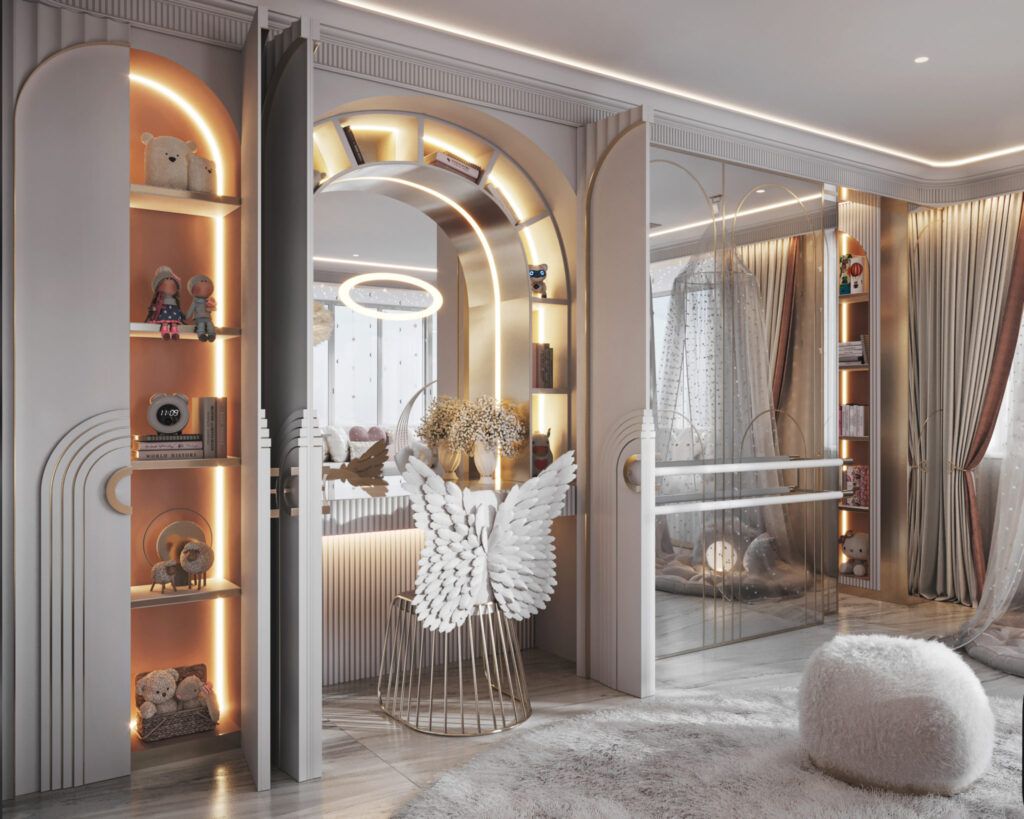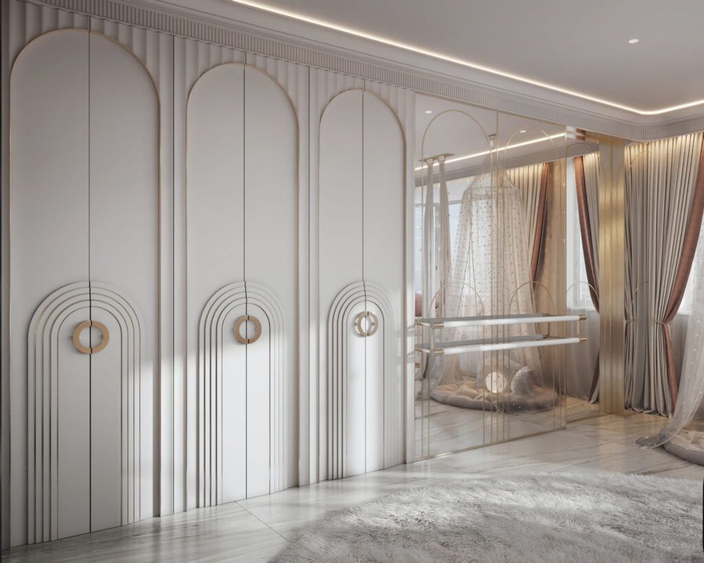 Неоклассический. Неоклассика – это более мягкая и современная версия классического стиля. Детская для девочки в неоклассическом стиле – это настоящая комната принцессы. Для него характерны дорогие, натуральные материалы отделки и мебели, натуральные цвета, геометрические и флористические орнаменты на обоях и текстиле, мебель с плавными, изогнутыми линиями, фасками и декоративными элементами в старинном стиле, подвесные потолочные люстры, картины и статуэтки в качестве декора.