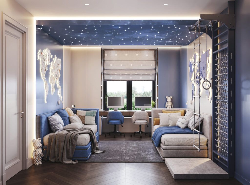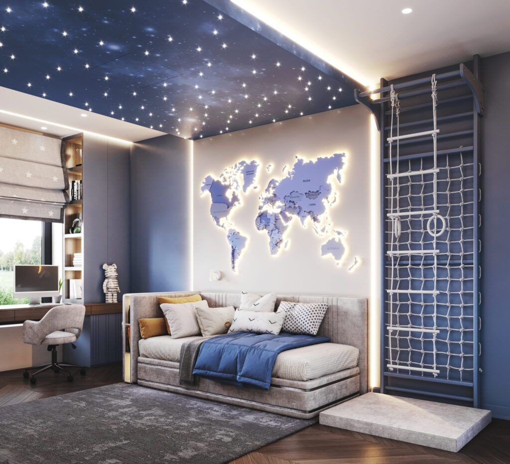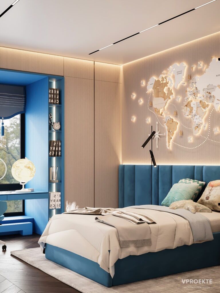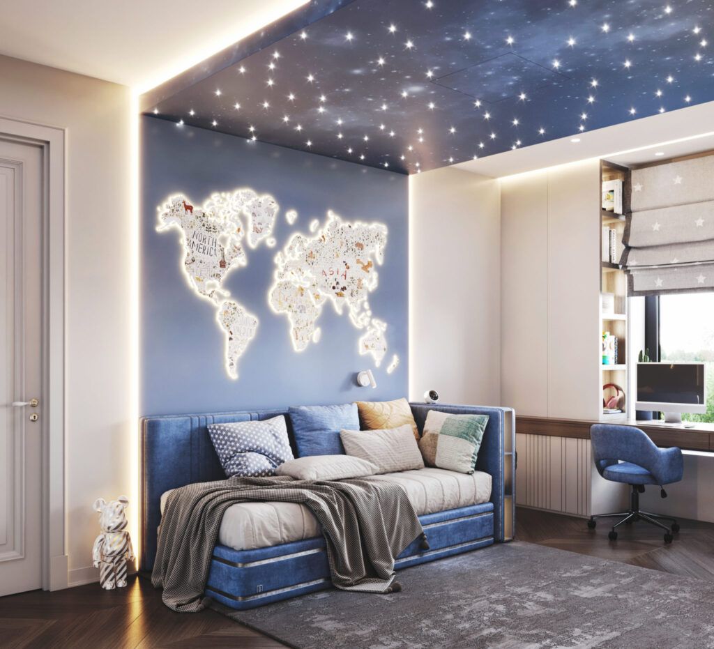 Самым ярким должно быть освещение в учебной зоне, чтобы ребенок сохранил хорошее зрение. Освещение в зоне кровати может быть неярким и приглушенным.