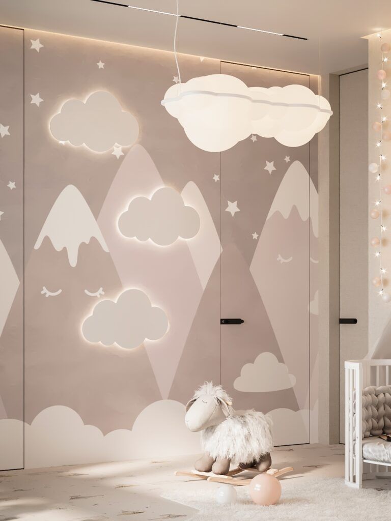 Настенные элементы. К ним относятся настенные светильники, детали стен с контурной подсветкой, светящиеся накладные элементы. Как и потолочные светильники, они служат не только для освещения, но и для украшения детской.