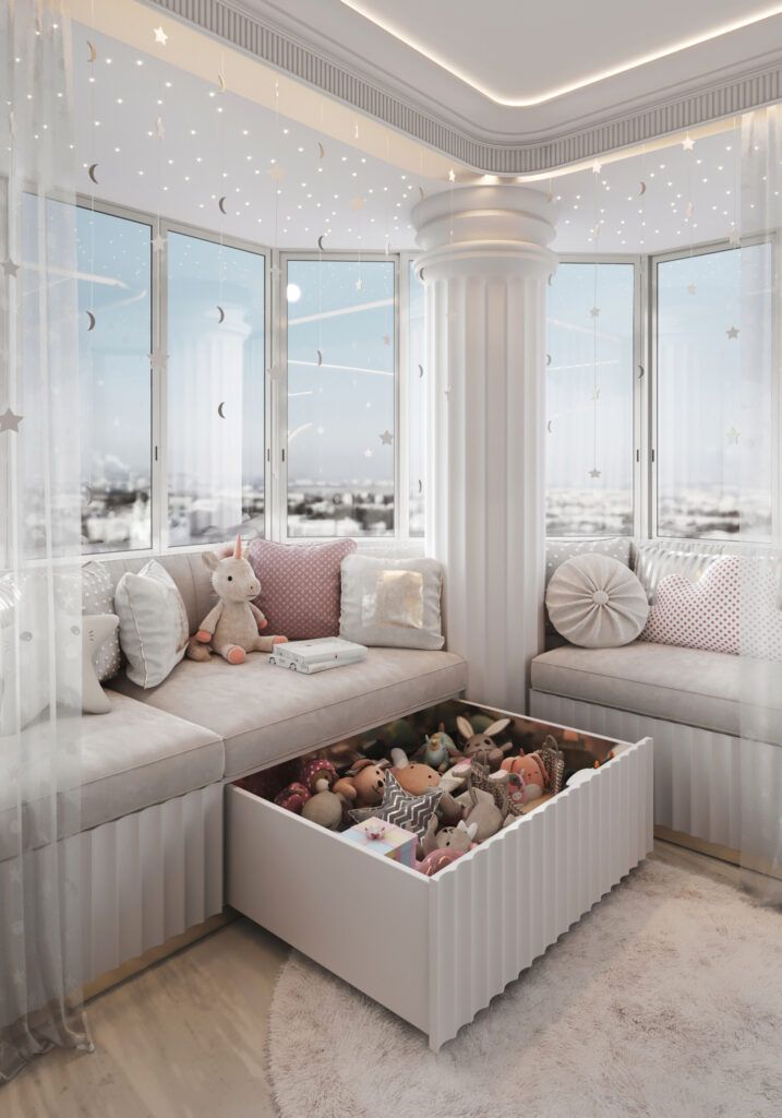 Классным решением станут пуфы и банкетки с выдвижными ящиками или поднимающимся сидением, внутри которых можно хранить игрушки.