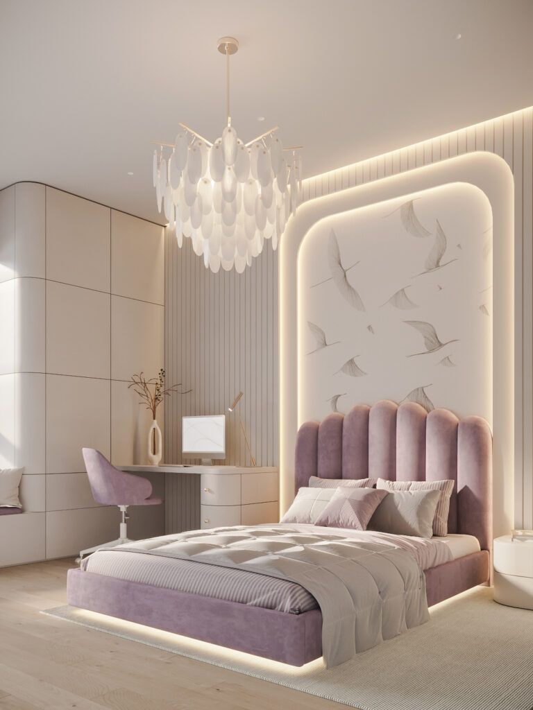 Стены комнаты девочки-подростка могут быть отделаны более сложными материалами: декоративной штукатуркой, фактурными и текстильными панелями. Интересный визуальный эффект дает подсветка по краям панелей.
