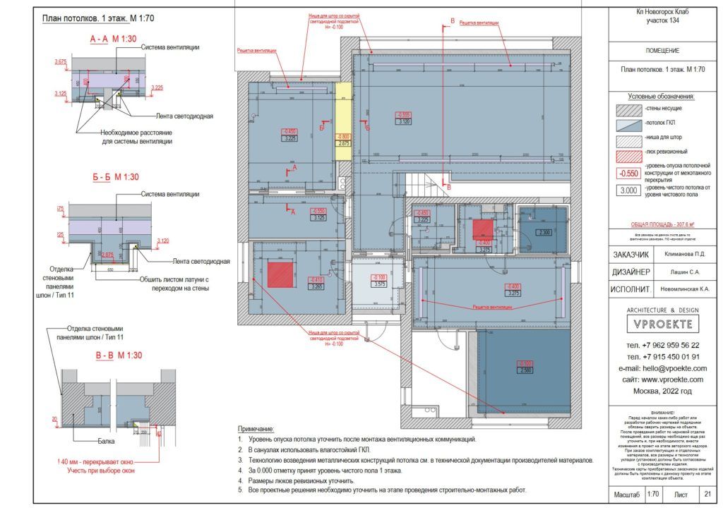 - План потолка содержит информацию о конструкции подвесных потолков, ниш для карниза и декоративных коробов; о расположении проводки, труб, встроенных осветительных приборов. В документе перечисляются виды отделочных материалов для потолка.