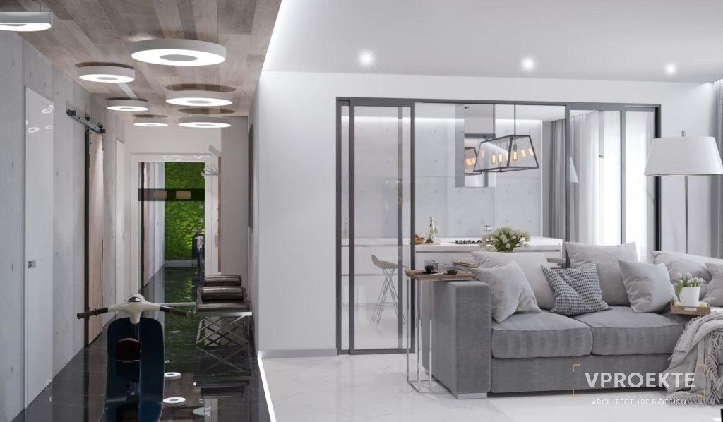Мы сделали помещение open space, начиная от холла и заканчивая гостиной и кухней, которая получилась стильная и минималистическая в черно-белых тонах, где высокие шкафы скрывают всю технику. Было очень важно сохранить пространство, поэтому мы разделили квартиру мобильной стеклянной перегородкой, которая при необходимости максимально задвигается к стене. Заказчик увлекается мотоциклами, поэтому прямо в холле мы поставили мопед, который прекрасно вписался в интерьер. Мы разделили черным и белым керамогранитом пол и потолок, который отделали в зоне прихожей паркетом. На нем удачно расположились белые, круглые светильники, напоминающие форму шин и колес, которые отражаясь от черного пола, создают еще больший контраст.