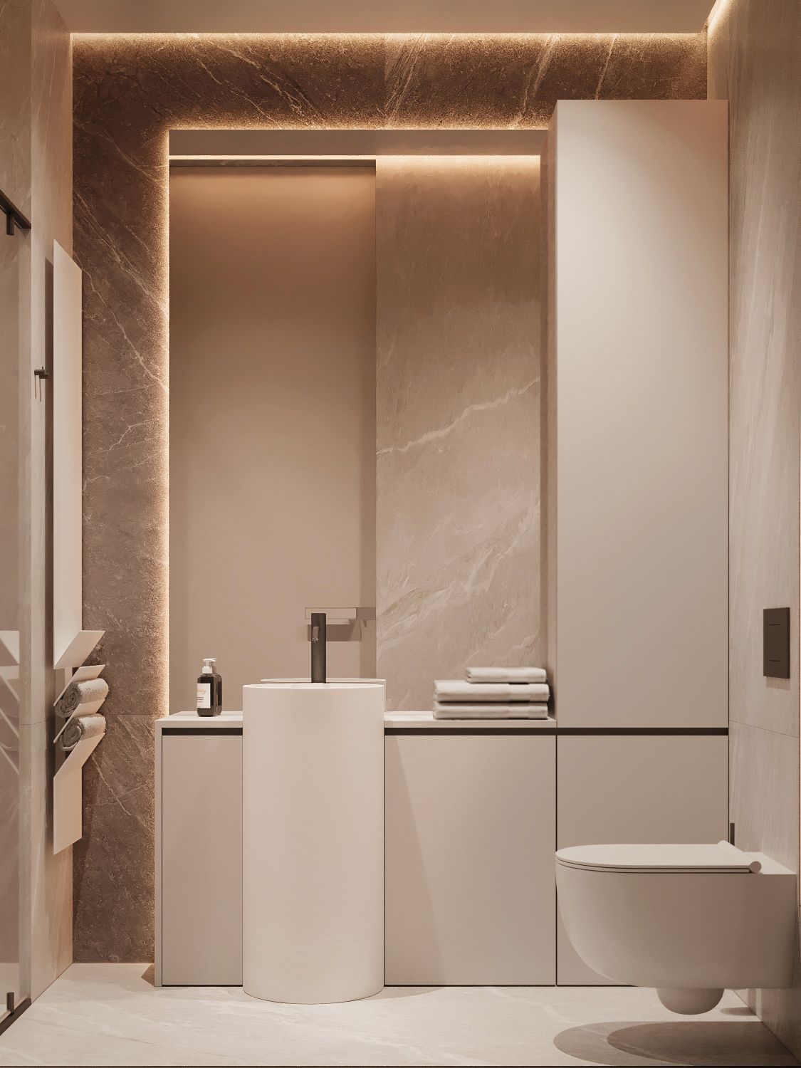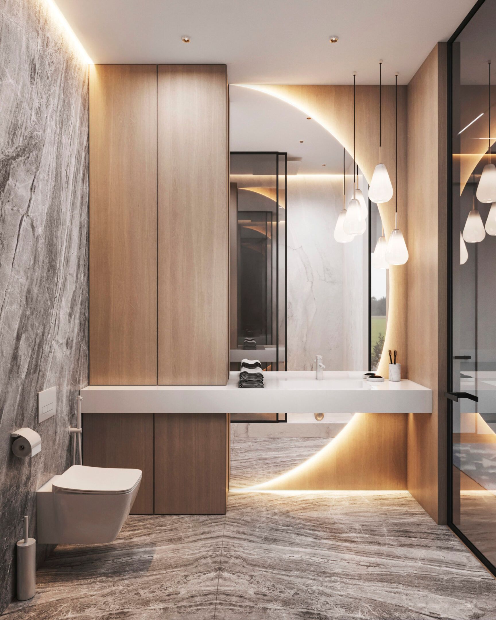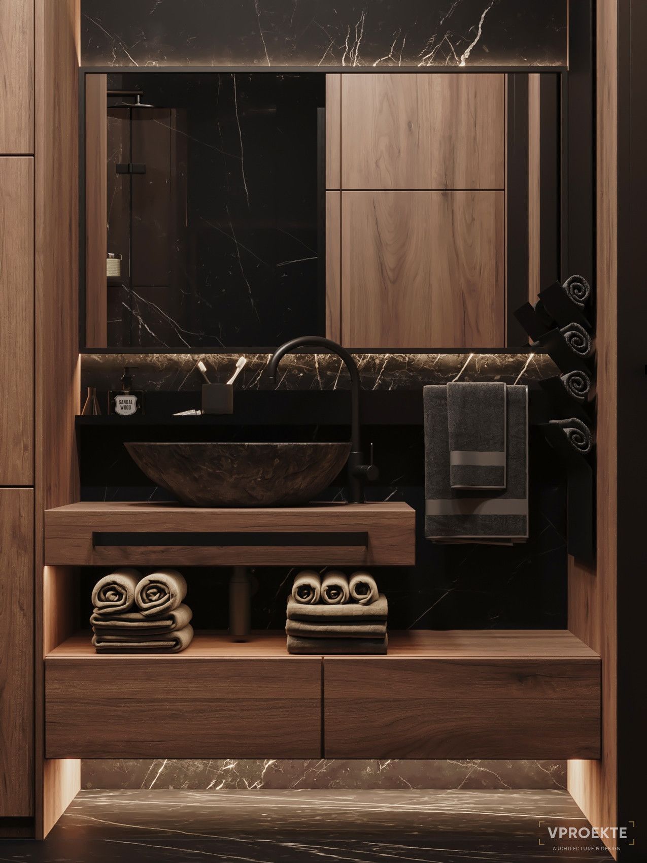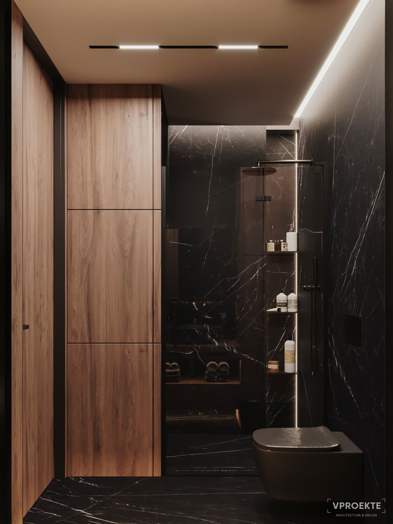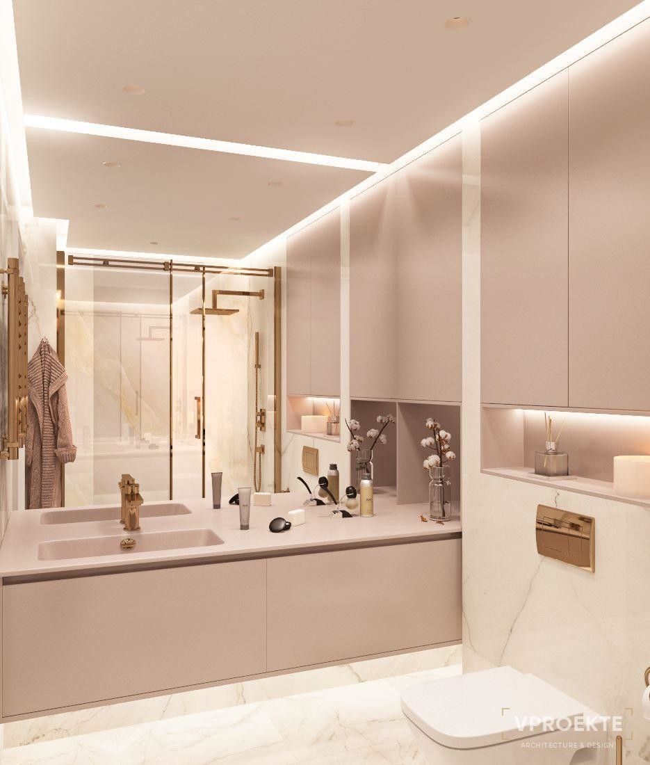 - Пристальное внимание уделяется технической стороне дизайн-проекта. Доступ к коммуникациям, гидроизоляция, мощная вытяжка, подогрев пола и зеркал — лишь часть аспектов, которые учитывают дизайнеры.