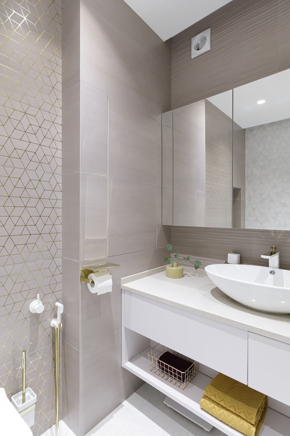 Актуален интерьер душевой комнаты с золотистыми элементами. Теплый металлический блеск присутствует на мебельной фурнитуре, аксессуарах, сантехнических приборах, плитке. В приоритете — оттенки бронзы и латуни.
