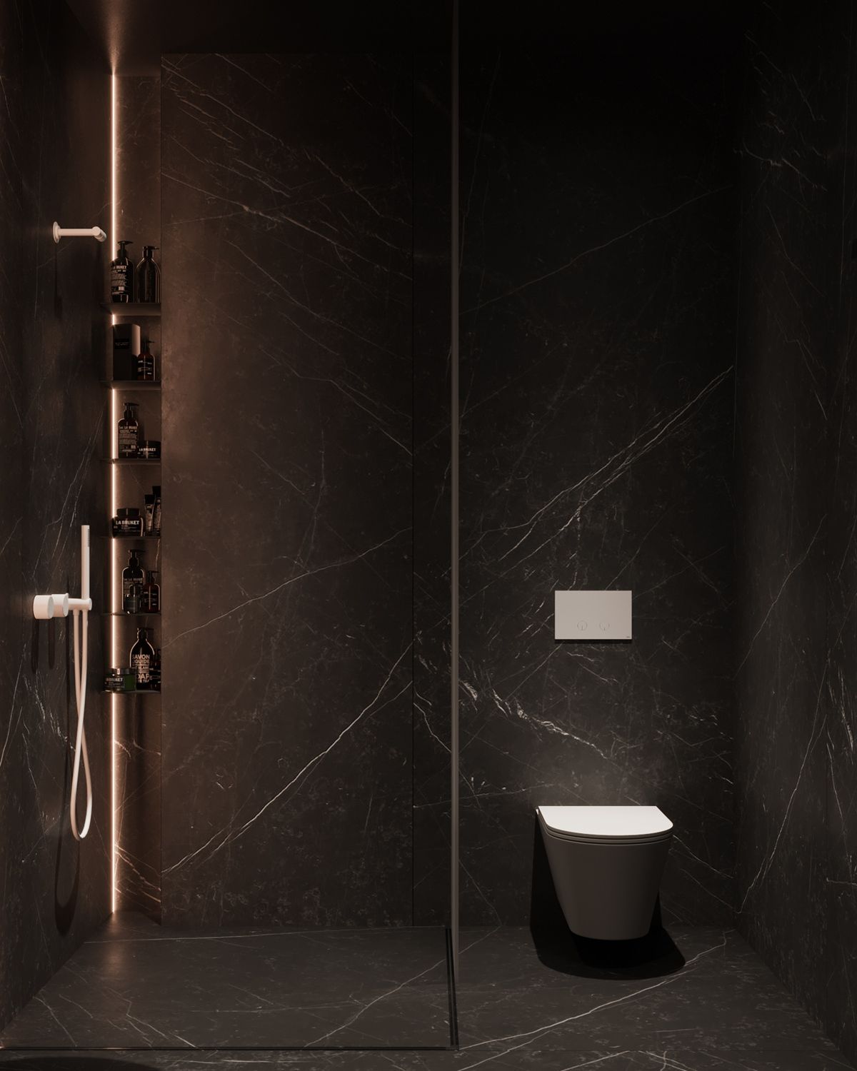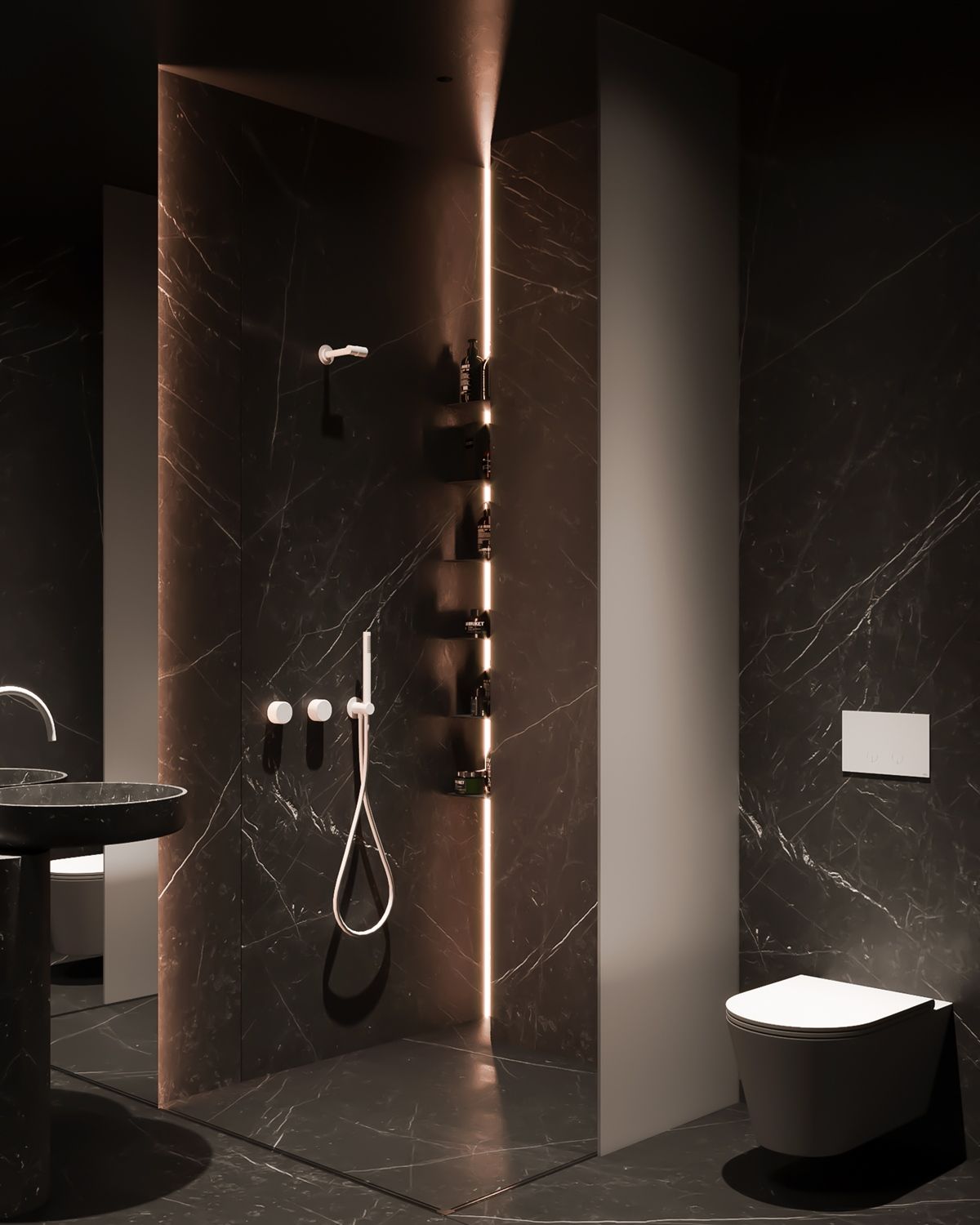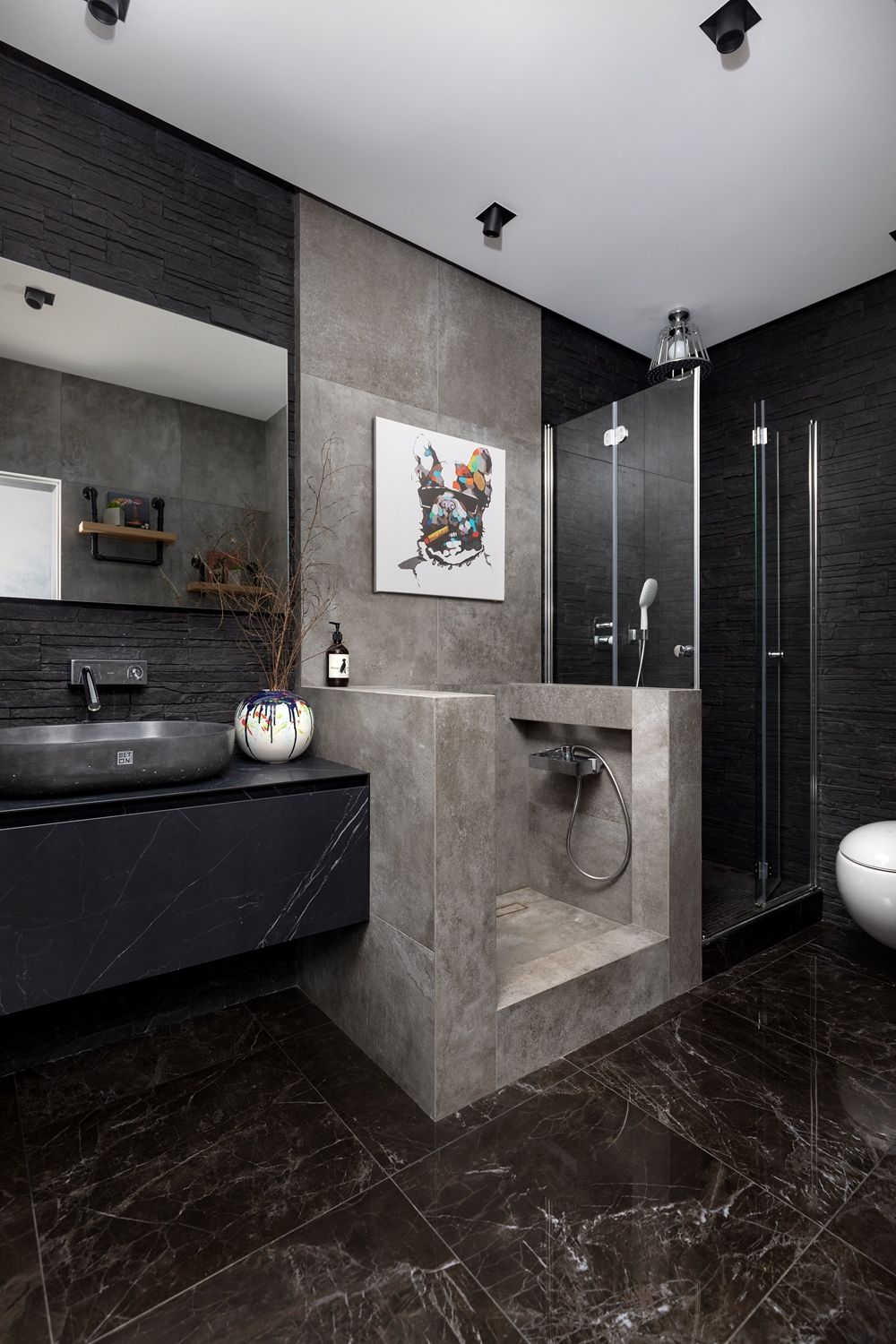 Сантехника черного цвета — сдержанный, но эффектный акцент, который разнообразит дизайн ванной комнаты с душевой кабиной. Это специфичное решение, ненавязчиво обращая на себя внимание, не надоест.
