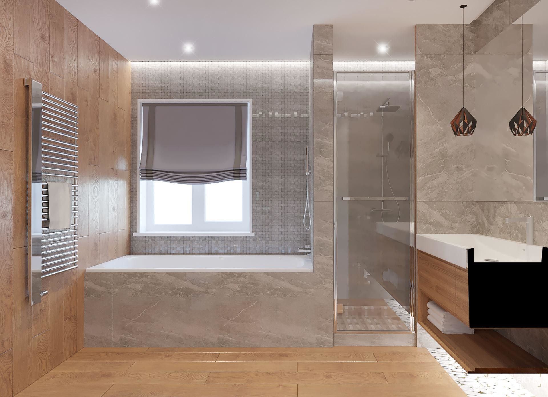 Фото дизайна ванны с душем из плитки в ЖК Freedom