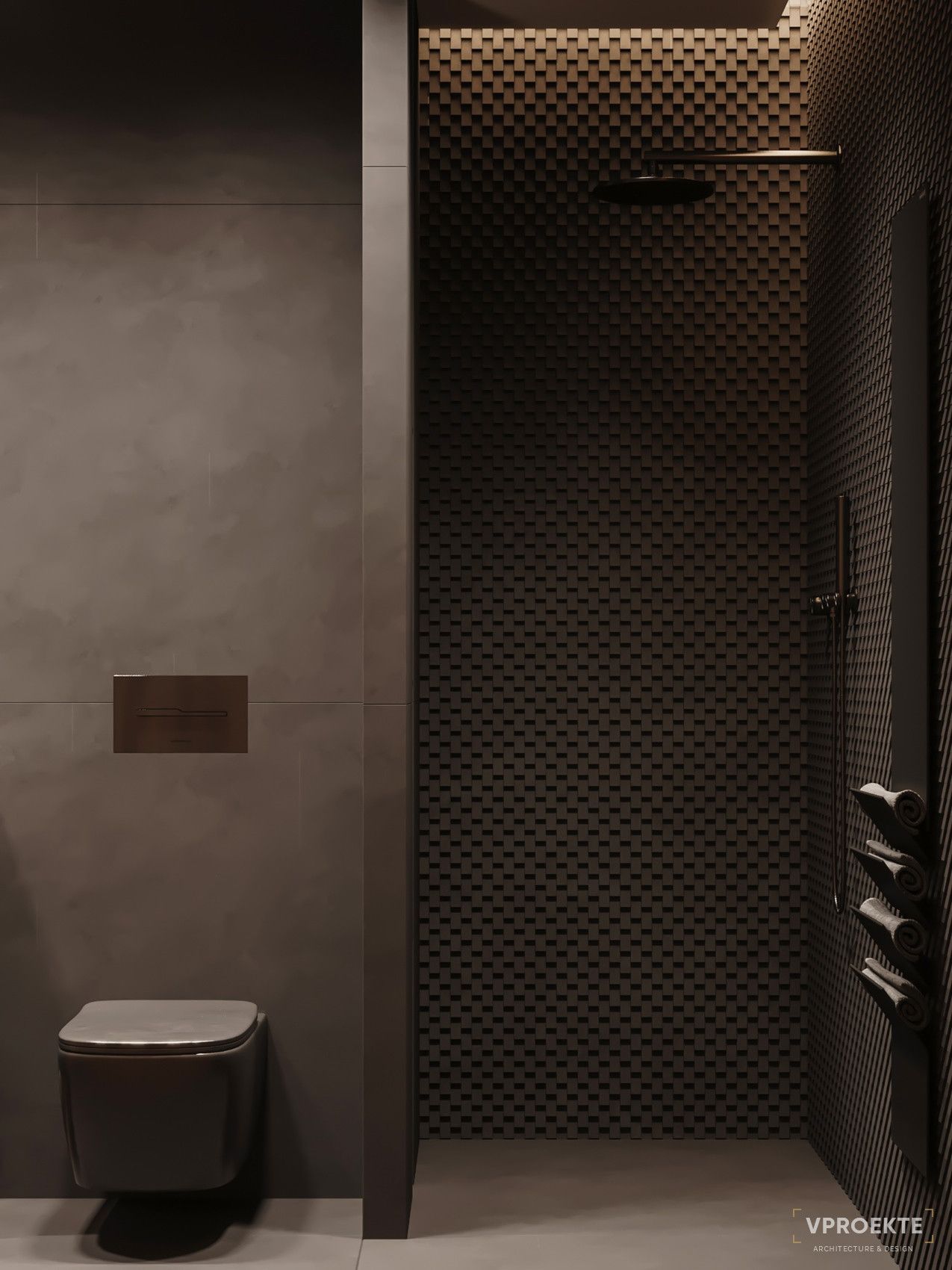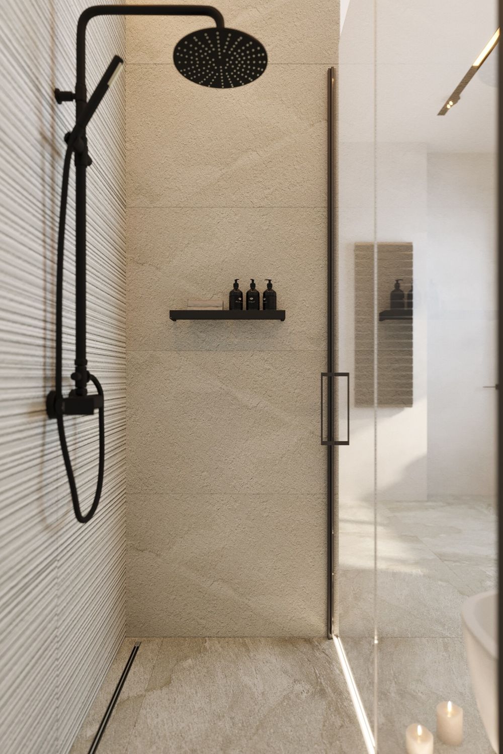 Небанально выглядит ванная комната с душевой из плитки под бетон. Такой брутальный керамогранит выпускается в разных цветах и форматах. Притягательная комбинация — плитка нейтральных цветов под бетон и рельефная.