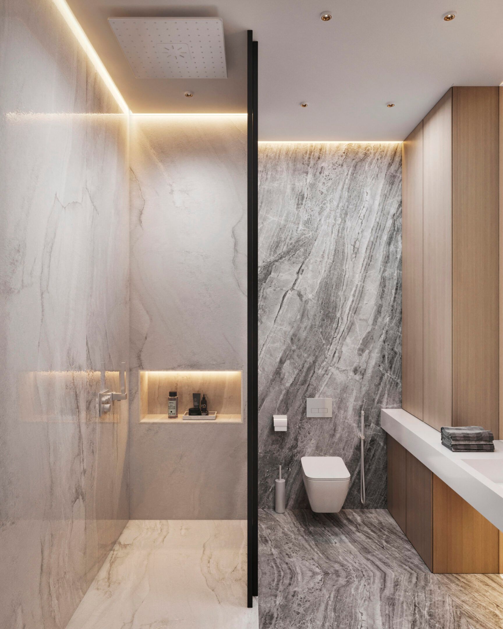 Природные фактуры — вне времени. Отделка душевой комнаты под мрамор облагораживает пространство. Натуральный камень капризен в эксплуатации. Поэтому его заменяют керамогранитом, тщательно соединяя края широкоформатной плитки, чтобы не нарушить целостность узора.