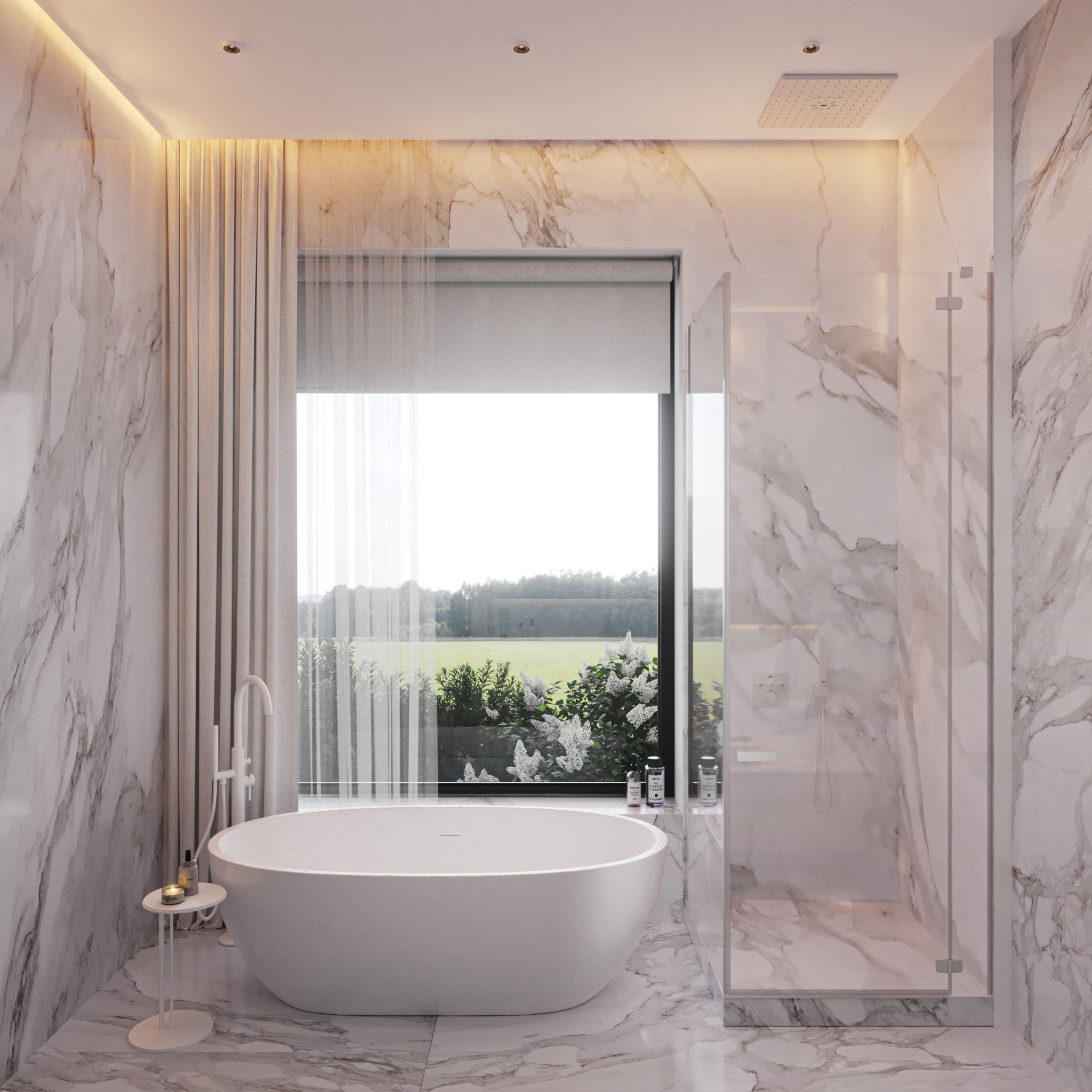 Дизайн интерьера душевой с отдельно стоящей ванной, например, у окна — роскошное решение, выводящее санузел из разряда утилитарных помещений. В таком случае специалисты Vproekte разрабатывают скрытые коммуникации, чтобы не нарушить легкость оформления комнаты.