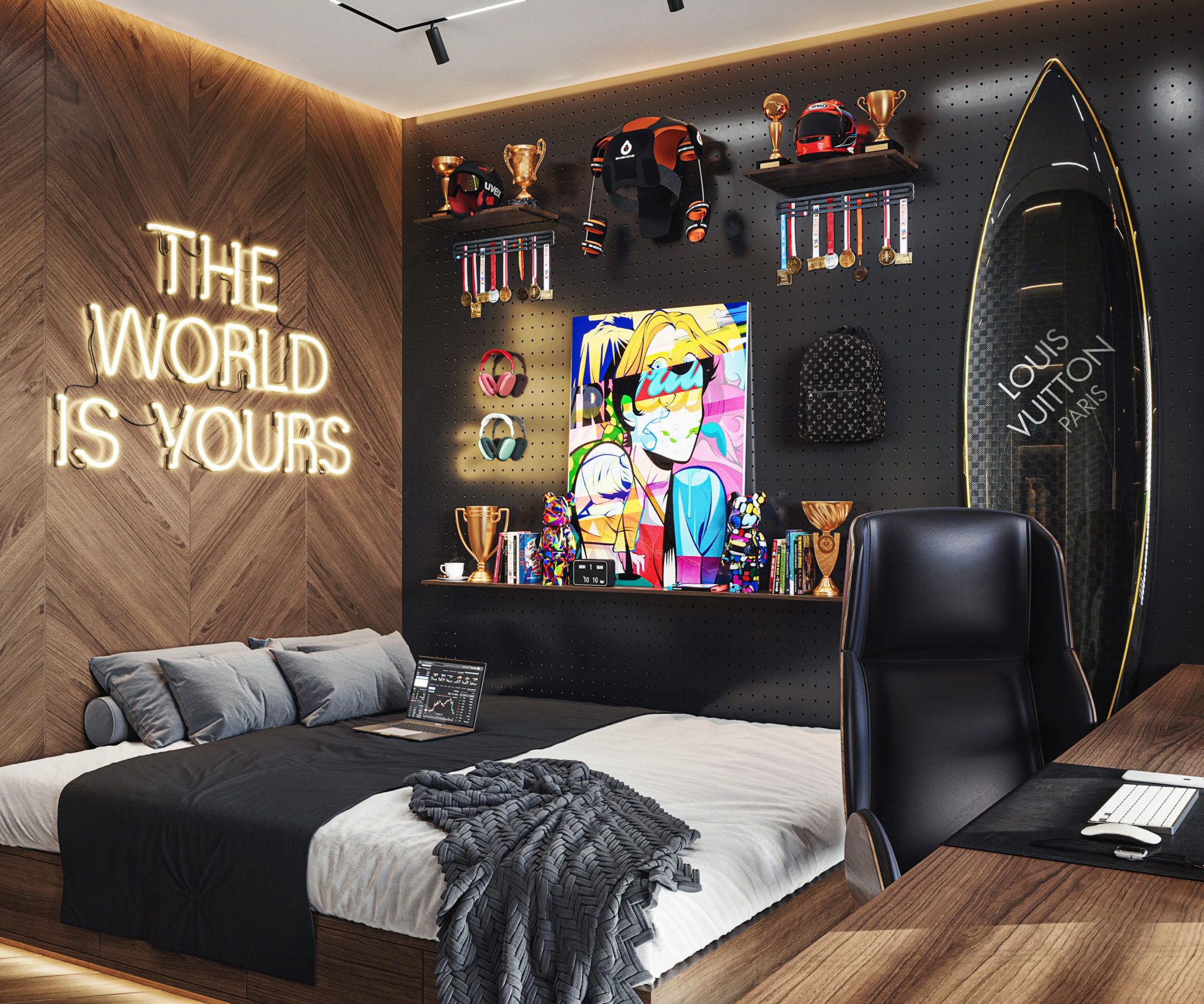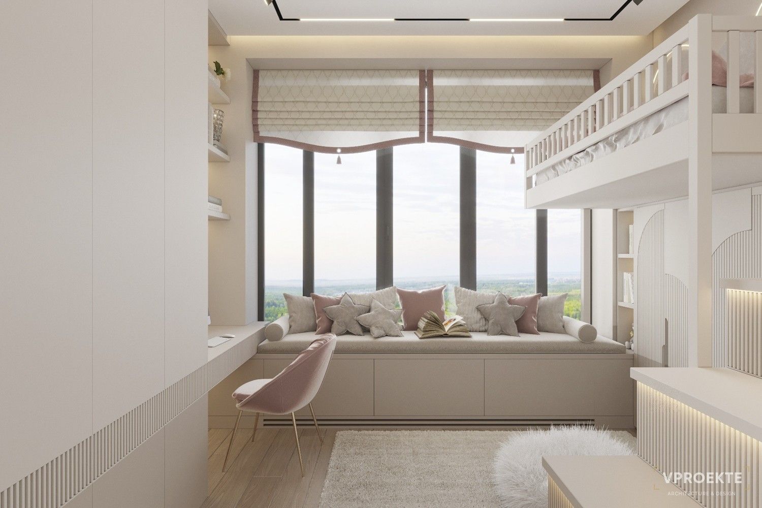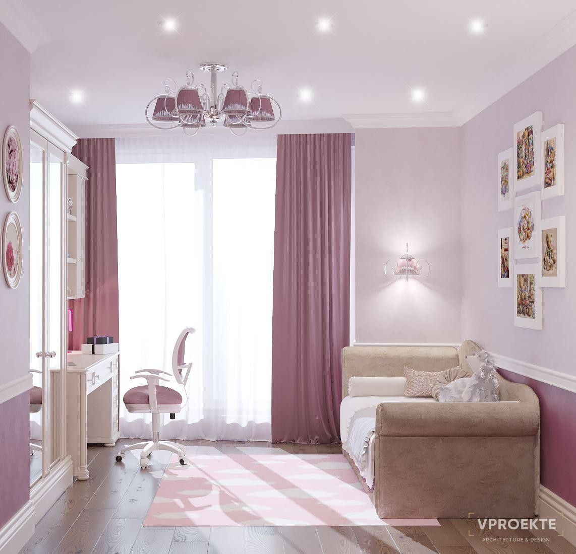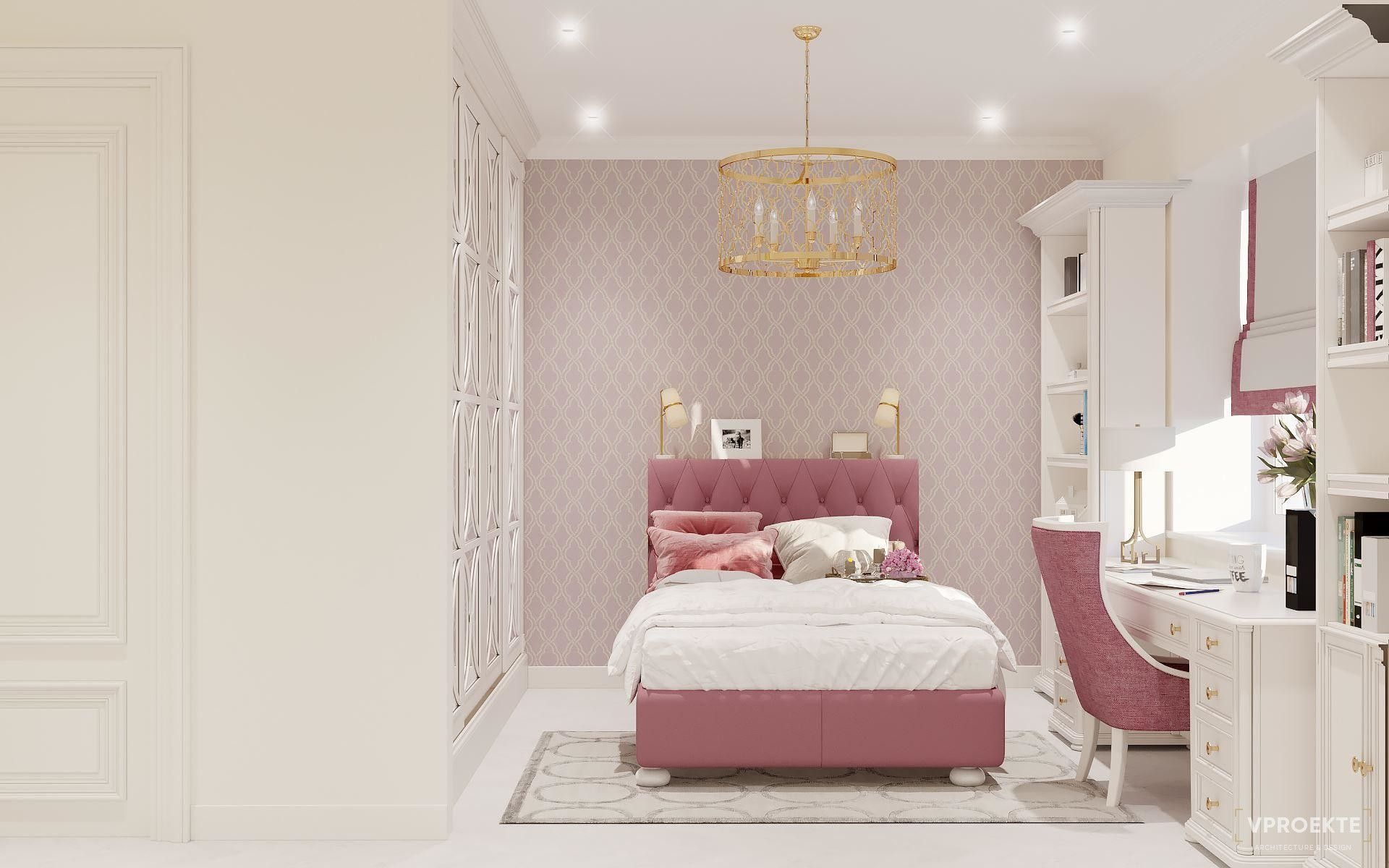 Для спальни школьницы или девочки-подростка можно использовать приглушенный розовый пастельного или припыленного оттенка в сочетании с серым, бежевым, синим или зеленым.