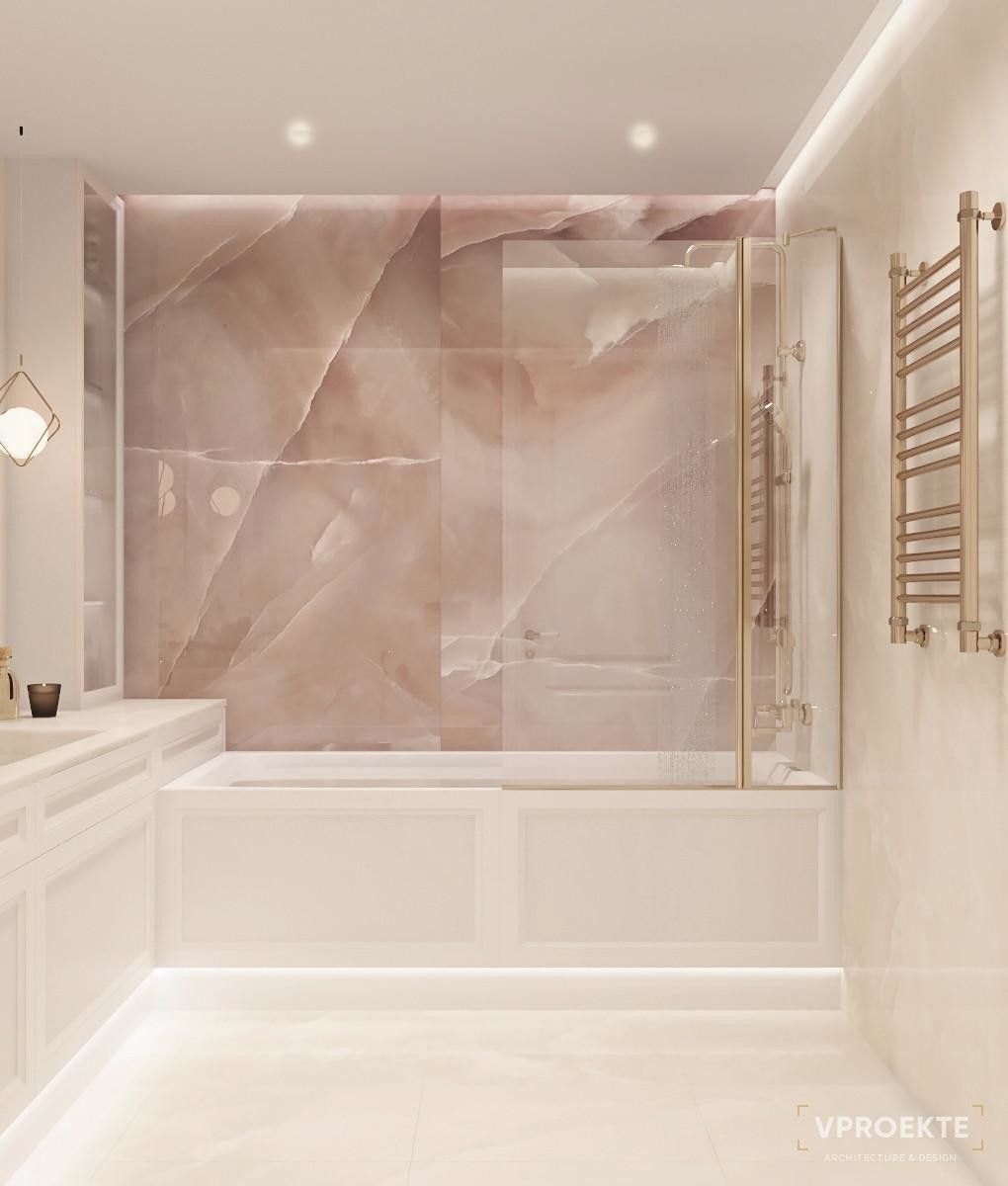 Особенно органично будет смотреться розовый в интерьере ванной в неоклассическом стиле. Для ручек, смесителей и кронштейнов дизайнеры рекомендуют использовать латунь, которая будет выгодно оттенять и подчеркивать розовый.
