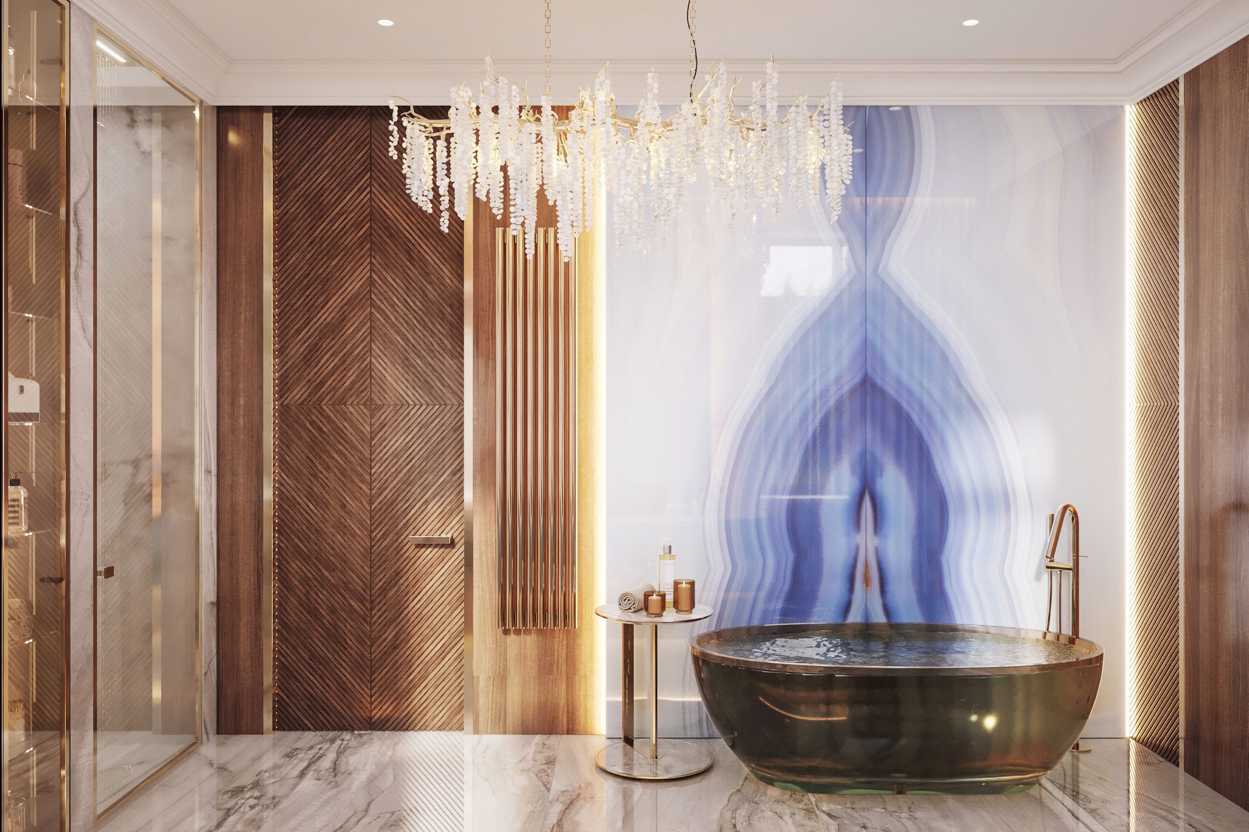 Мрамор всегда в моде, но тренд 2023 года — темно-синий камень с белыми или бледно-голубыми прожилками. Туалетные столики, кухонные столешницы, тумбы для умывальника – сфера применения не ограничена. Натуральный материал – пористый, поэтому подвержен загрязнениям. Заменить его сможет качественный керамогранит или искусственный камень соответствующей расцветки.